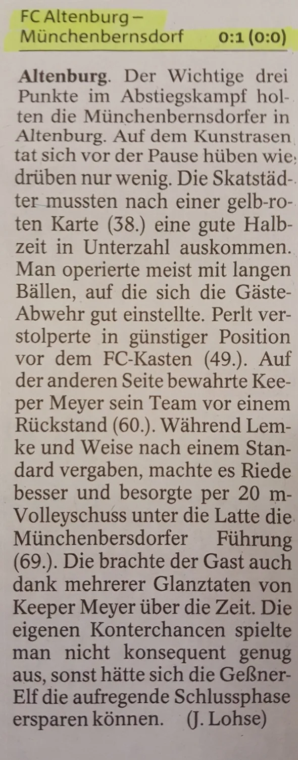In der 69. Minute setzt Robby Riede mit einem Weitschuss aus fast 20 Meter aufs Altenburger Gehäuse an. Die Kugel fällt gnadenlos kurz unter der Torlatte ein und lässt dem Altenburger Keeper keine Abwehrchance. Zu diesem Zeitpunkt stand die Partie auf genau diesem Punkt, wer hier trifft wird vermutlich auch die Punkte mitnehmen. Altenburg wird jetzt mutiger. Es beginnt das vielleicht zu Späte Anrennen der Altenburger. Auf alle Fälle sorgen jetzt die Hausherren für Torgefahr. Doch der Schlussmann der Gäste, David Meyer hält mit seinen Paraden die Führung fest und sorgt in seiner Ecke für die stehende Null. Altenburg muss erneut den Schlusspfiff mit einem Rückstand entgegennehmen und ohne Punkte aus der Partie scheiden. Für die Gäste aus Münchenbernsdorf schaffen die Punkte Abstand zur Abstiegszone und sorgen für zeitweile Entspannung im Feld der KOL.